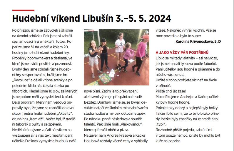 Tímto bych chtěla poděkovat Andree Frašové za zábavná rytmická a pěvecká cvičení, paní učitelce Kátě Holubové za super venkovní hry a výborná jídla, která pomáhala vařit Štěpánka Barešová z 9.C a kluci z 9. ročníku.