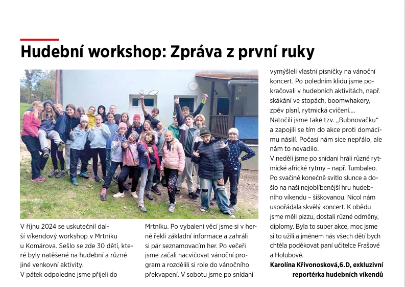 V říjnu 2024 se uskutečnil další víkendový workshop v Mrtníku u Komárova. Sešlo se zde 30 dětí, které byly natěšené na hudební a různé jiné venkovní aktivity.